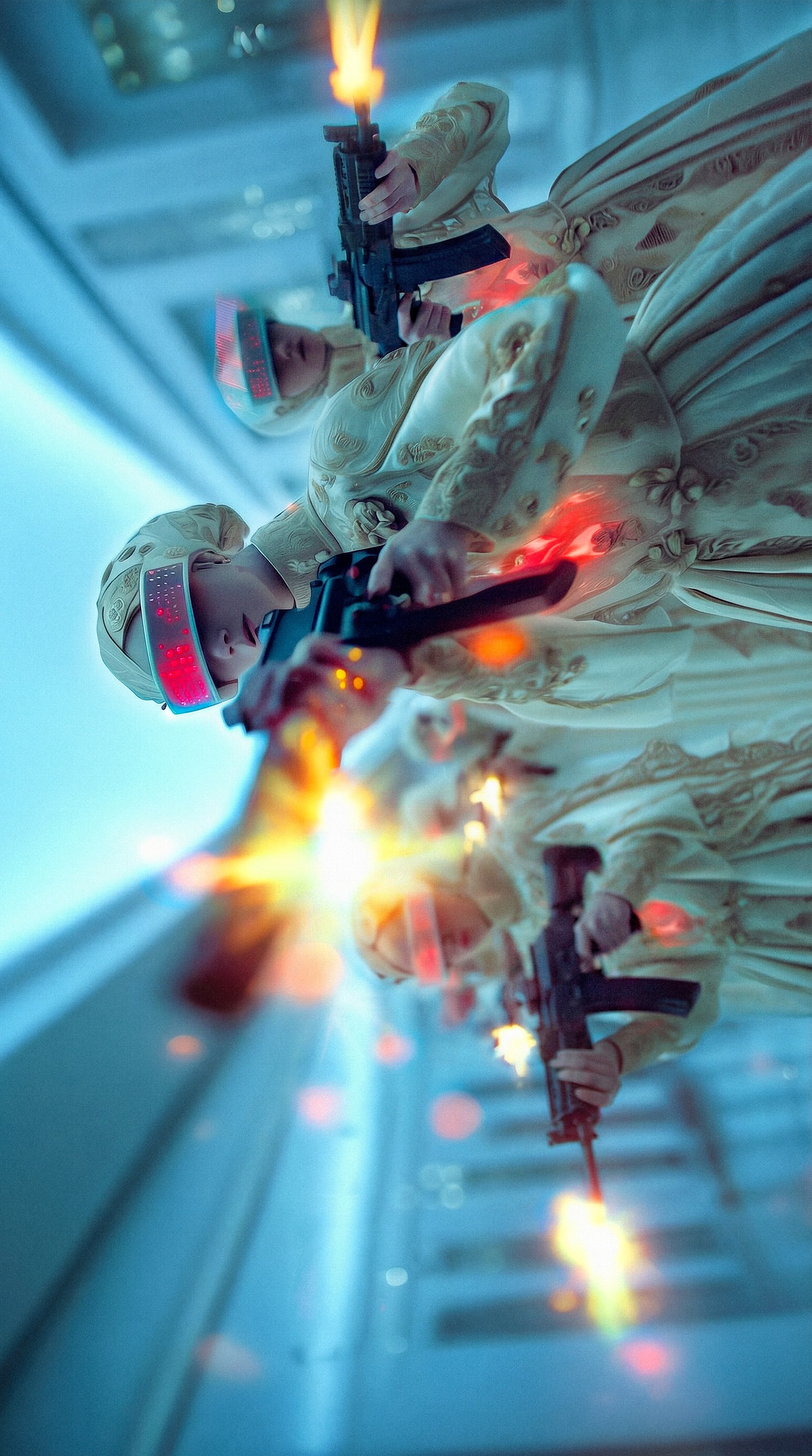 This body of work draws from the visual languages of pop art, fashion, and cinema to construct narrative images set in imagined futures. Using widely recognizable iconography, the images explore power, authority, control, and defiance. Women occupy roles traditionally reserved for men in popular cinema, figures of enforcement, dominance, and confrontation, as a deliberate play on cinematic stereotype. Class disparity is central to the work, as is the role of technology as a tool of control and subversion.